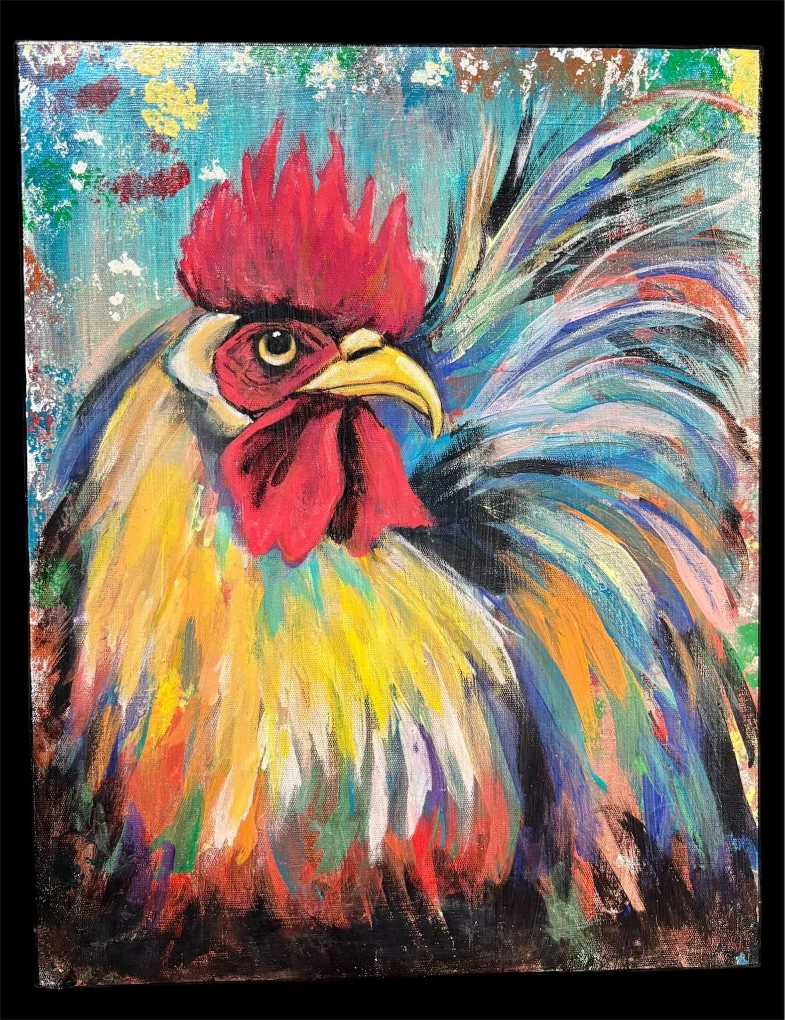 a 11' x 14' Acrylic painting of a rooster titled "Rise & Ruffle". You either ruffle the day or you are ruffled by the day!